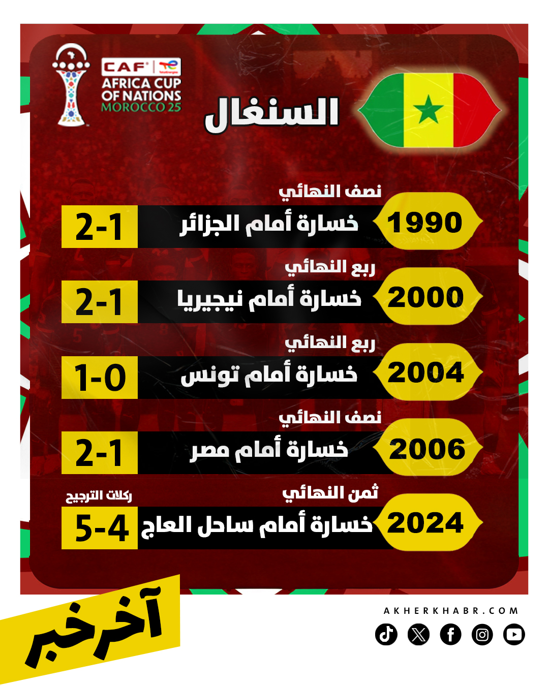 يخوض منتخب السنغال النهائي الرابع في تاريخه بكأس أمم أفريقيا، والأول منذ تتويجه باللقب القاري عام 2021، فيما يظهر منتخب المغرب في النهائي للمرة الثانية فقط، بعد تتويجه التاريخي عام 1976، وغياب طويل عن المشهد الختامي منذ نسخة 2004، ليبقى النهائي الحالي فرصة ذهبية لكتابة تاريخ جديد أمام جماهيره.