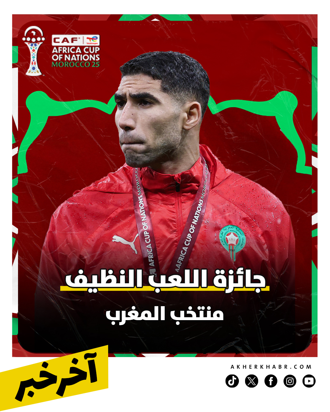 كرّمت اللجنة المنظمة لبطولة كأس أمم إفريقيا منتخب المغرب بجائزة الروح الرياضية، تقديرًا للانضباط والالتزام والسلوك المثالي الذي قدمه الفريق طوال مشواره في البطولة. وتسلم الجائزة النجم أشرف حكيمي، قائد المنتخب المغربي، في لقطة لاقت إشادة واسعة من المتابعين والمحللين.