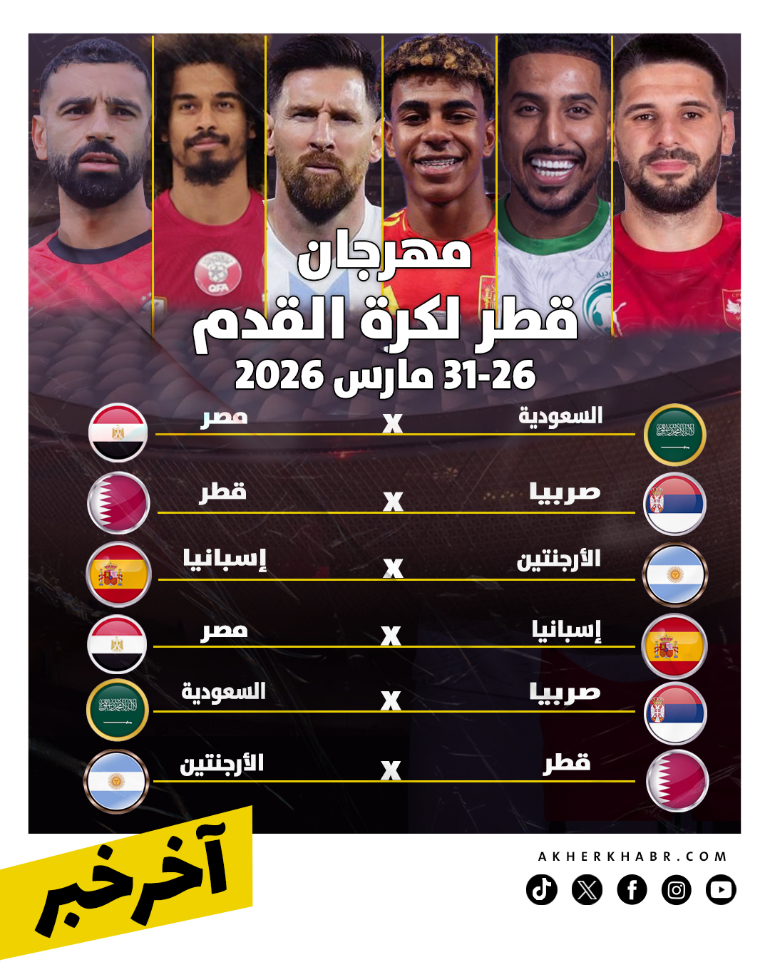 أزاحت الدوحة الستار عن واحدة من أبرز الفعاليات الكروية المنتظرة، بعدما أعلنت اللجنة المحلية المنظمة لأحداث كرة القدم إطلاق مهرجان قطر لكرة القدم 2026، والذي يُقام خلال الفترة من 26 إلى 31 مارس المقبل، بمشاركة منتخبات قطر ومصر والسعودية وصربيا، إلى جانب إقامة مباراة كأس فيناليسيما المرتقبة.