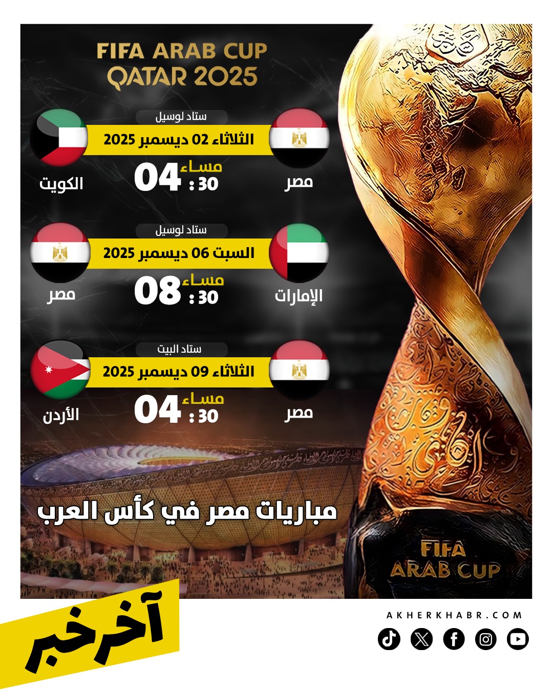 يستهل الفراعنة مشوارهم فى بطولة العرب بمواجهة الكويت يوم 2 ديسمبر على ملعب لوسيل في الرابعة والنصف مساءً، ثم يصطدم المنتخب بنظيره الإماراتي في الجولة الثانية يوم 6 ديسمبر، على نفس الملعب فى الثامنة والنصف مساءً، قبل أن يختتم الدور الأول بمواجهة الأردن يوم 9 ديسمبر على ملعب البيت فى الرابعة والنصف مساءً، في مواجهات حاسمة ينتظرها الجمهور بحثًا عن بداية قوية ومنافسة شرسة على بطاقة التأهل.