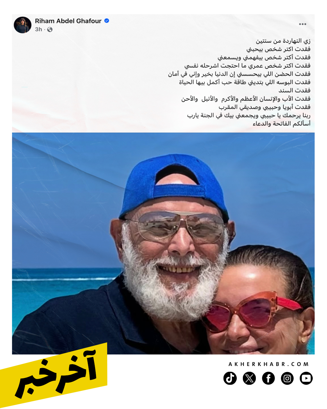 أحيت ريهام عبدالغفور ذكرى وفاة والدها أشرف عبدالغفور، معبرة عن ألمها لفقدانه والشعور بالفراغ بعد رحيله، وذلك عبر حسابها الشخصى على فيسبوك.