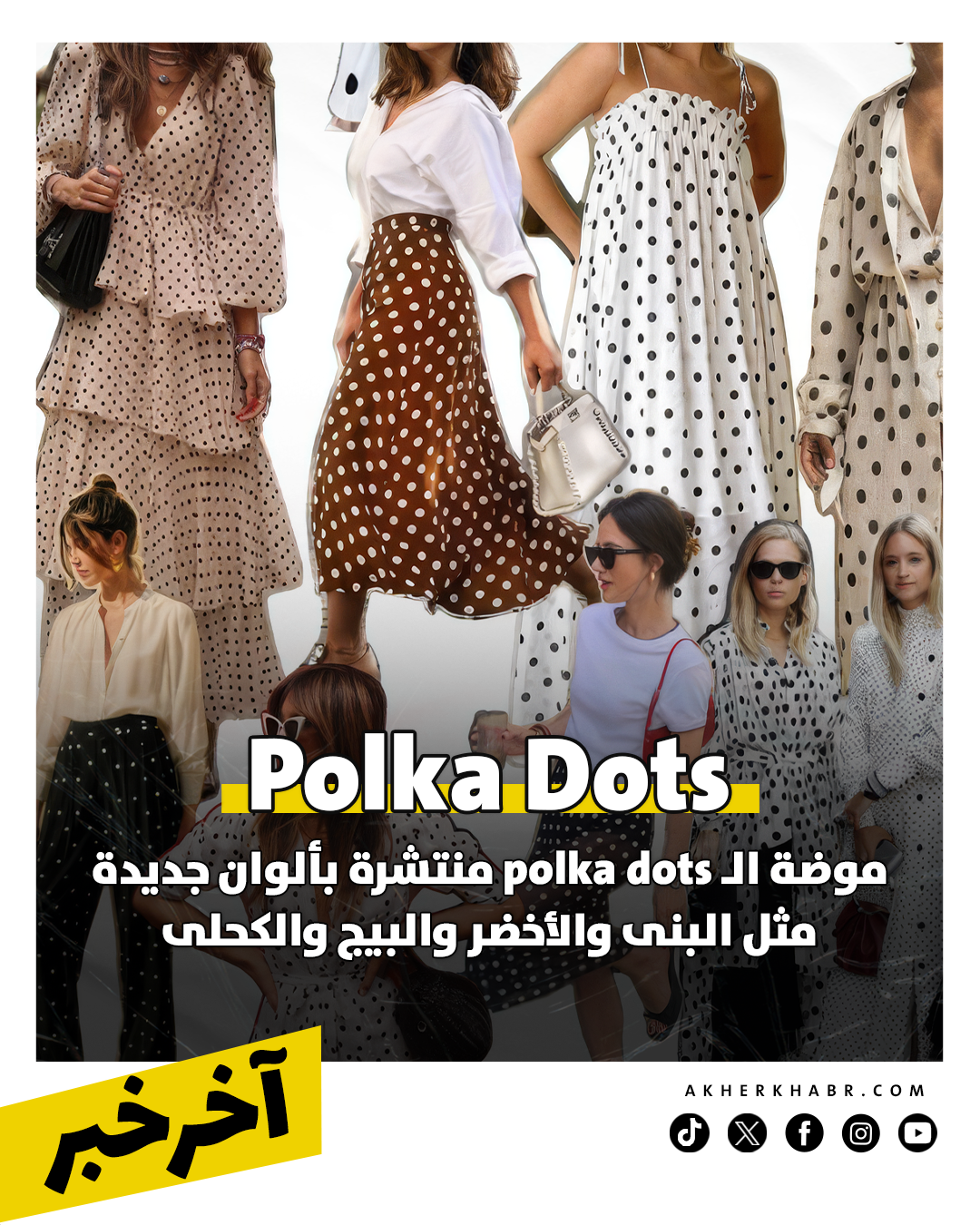 موضة الـ polka dots ظهرت فى القرن الـ 19، ووثقت فترة الخمسينات بالعصر الذهبى لهذا الترند، الذى عاد مجددا لساحة الموضة، ومن الواضح أنه سينافس بقوة ضمن تقاليع الملابس فى ربيع وصيف 2026، لكن دون الاعتماد على اللونين الأبيض والأسود فى موضة الـ polka dots، وسنجد ألوان جديدة مثل البنى، الأخضر، البيج، الكحلى وغيرهم من الألوان المرتبطة بموضة صيف 2026.