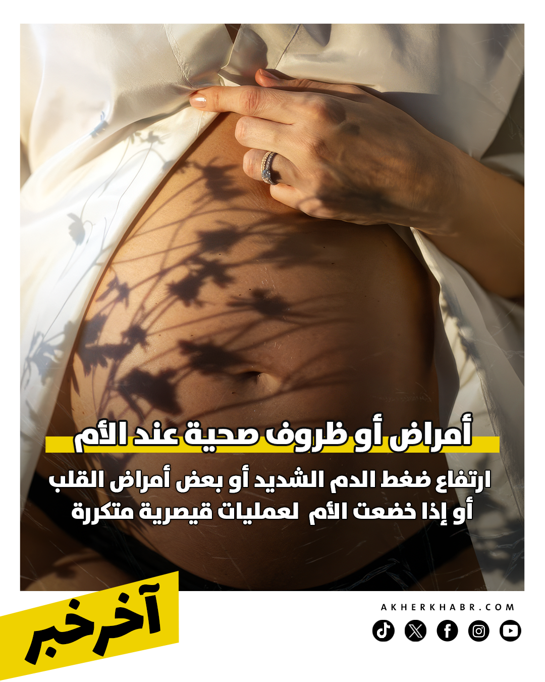 ارتفاع ضغط الدم الشديد، أو بعض أمراض القلب، أو إذا خضعت الأم لعمليات قيصرية متكررة فى وقت قصير، الولادة القيصرية تكون الخيار الأكثر أمانًا.