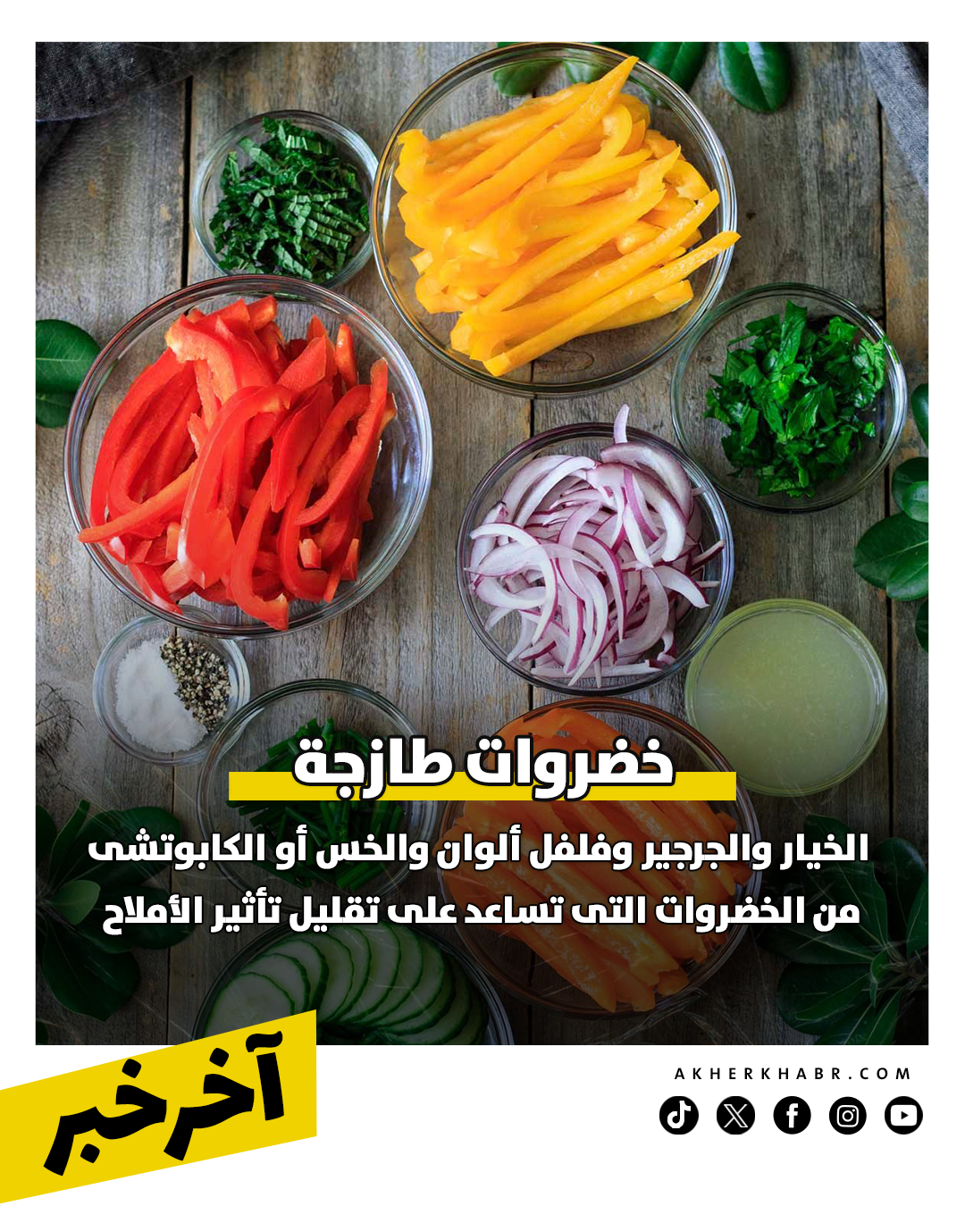 الخيار، الجرجير، فلفل ألوان، و الخس أو الكابوتشي، من الخضروات التي تساعد على تقليل تأثير الأملاح وتعطى إحساسا بالانتعاش وتوازن الوجبة، يمكن تقديمهم على شكل شرائح كبيرة فى طبق منفصل علي السفرة، أو علي شكل سلطة مضاف لها ليمون وخل وزيت زيتون.