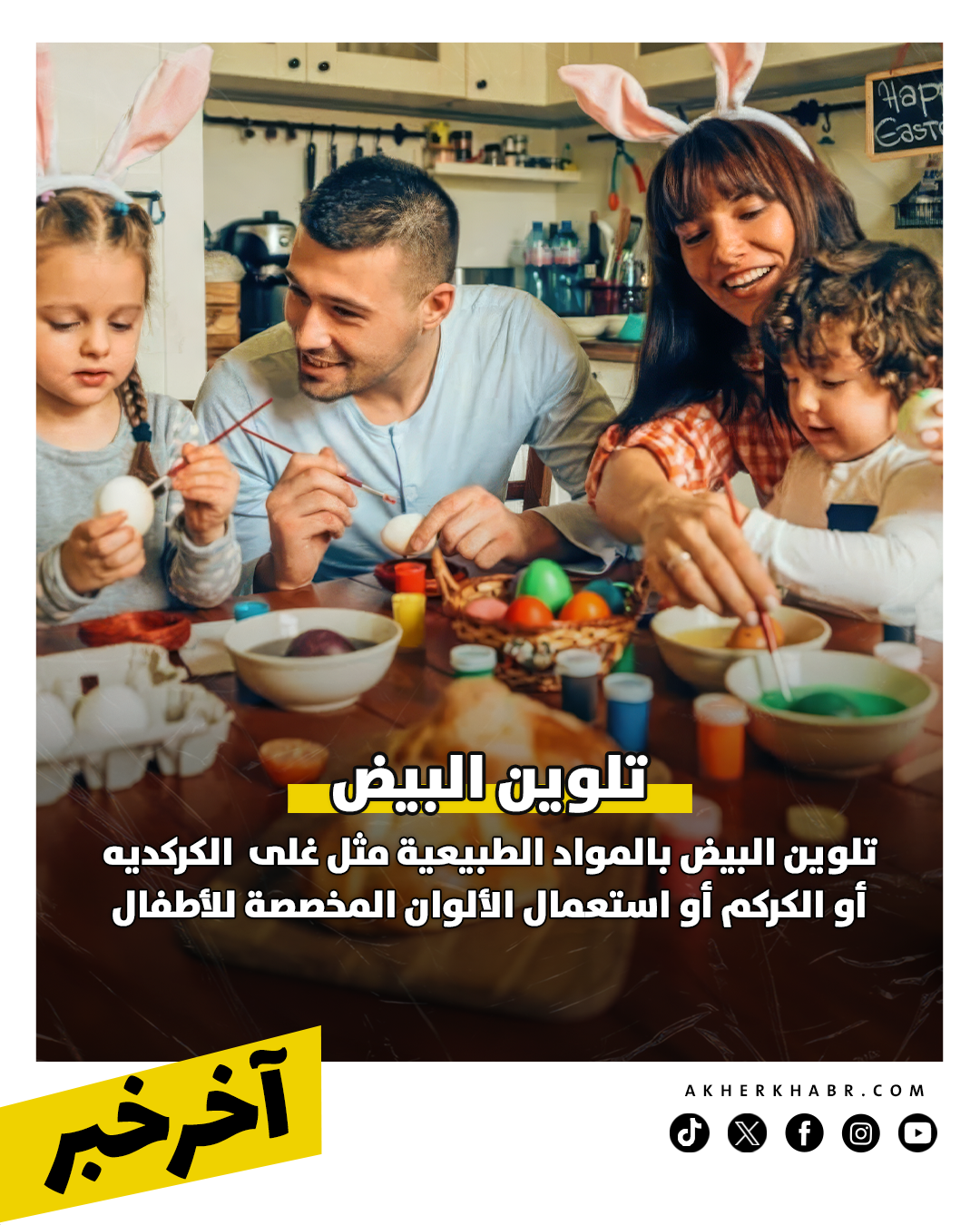 من العادات المصرية المرتبطة بيوم شم النسيم، تلوين البيض، هنالك طرق كثيرة يمكنك تلوين البيض بيها، سواء بالمواد الطبيعية مثل غلى الكركديه أو الكركم ونقعد البيض فيهم، أو استعمال ألوان طعام، أو الألوان المخصصة للأطفال، واتركى كل طفل يستمتع بتصميم البيض الخاص به.