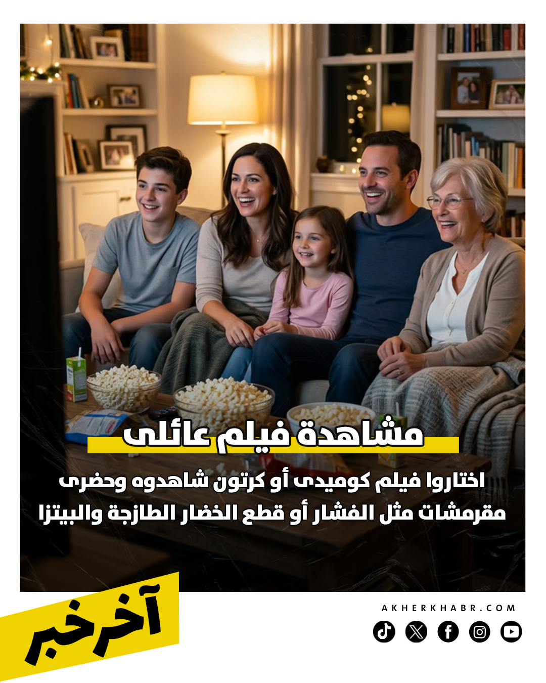 اختاروا فيلم كوميدى أو كرتون شاهدوه، وحضرى مقرمشات مثل الفشار أو قطع الخضار الطازجه أو بيتزا مجهزه فى المنزل.