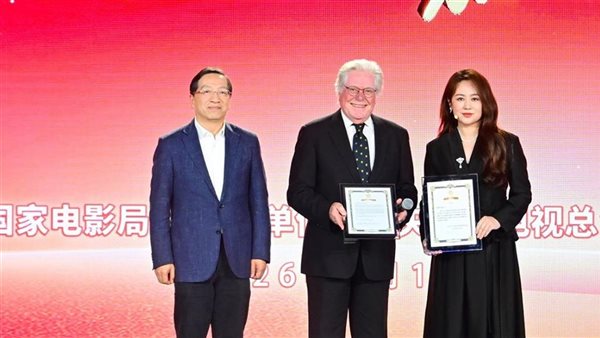 كرّم الوزير الصيني شين هايشيونغ، رئيس مجموعة الصين للإعلام CMG، الفنان الكبير حسين فهمي، رئيس مهرجان القاهرة السينمائي الدولي، خلال فعاليات كرنفال ثقافة السينما في دلتا نهر يانغتسي 2026 المنعقد في مدينة نينغبو بمقاطعة تشجيانغ في جمهورية الصين الشعبية، والتي ينظمها مجموعة الصين للإعلام بالتعاون مع لجنة الحزب بمقاطعة تشجيانغ.