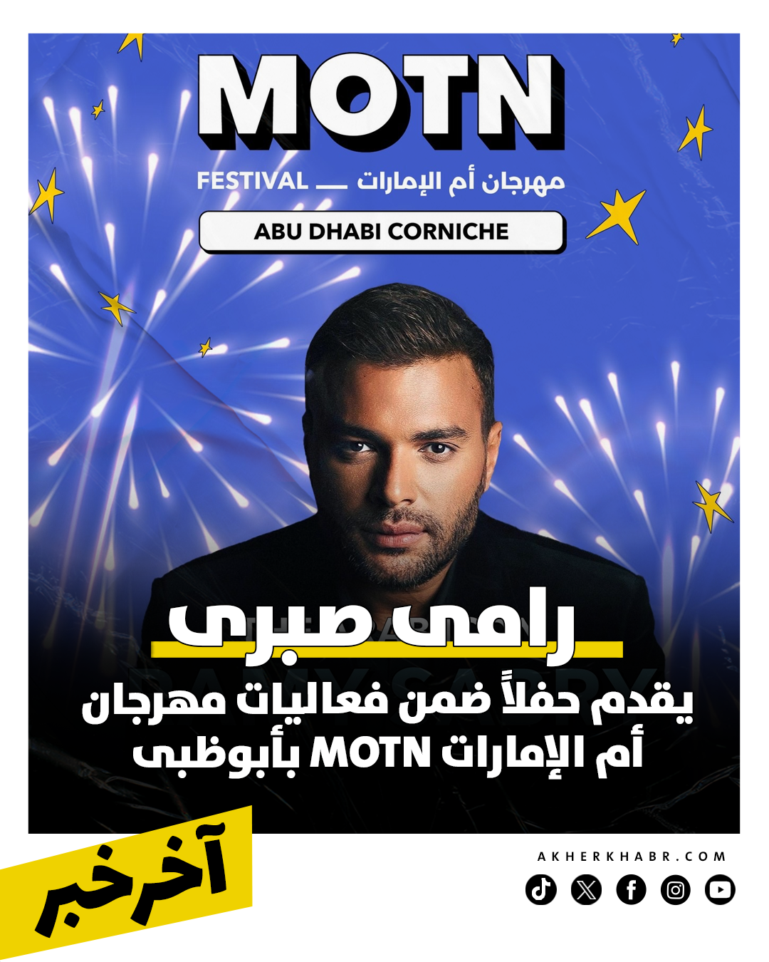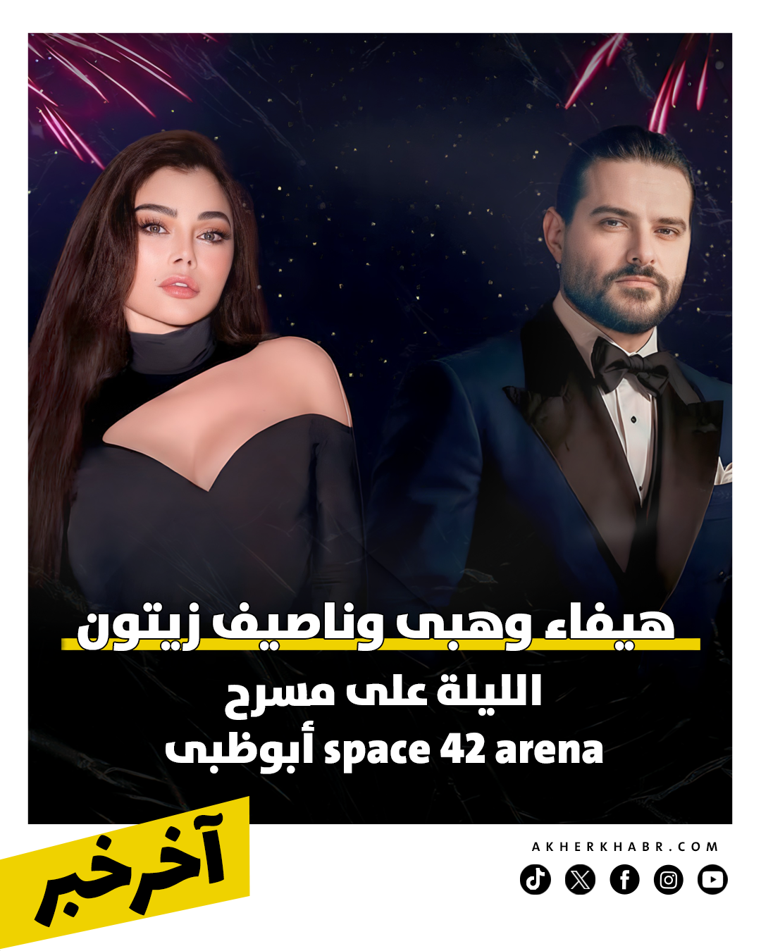 يحيي رامي صبري حفل رأس السنة في أبو ظبي، ضمن فعاليات مهرجان أم الإمارات، بينما يجتمع الثنائي هيفاء وهبي وناصيف زيتون في حفل غنائي ضخم يوم 31 ديسمبر على مسرح Space 42 Arena.