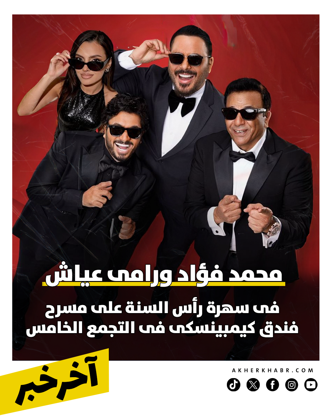 ويشهد التجمع الخامس حفلًا غنائيًا يجمع رامي عياش ومحمد فؤاد ومصطفى حجاج ليلة 31 ديسمبر، إلى جانب حفل آخر يضم صابر الرباعي ورضا البحراوي بفندق سميراميس إنتركونتيننتال.
