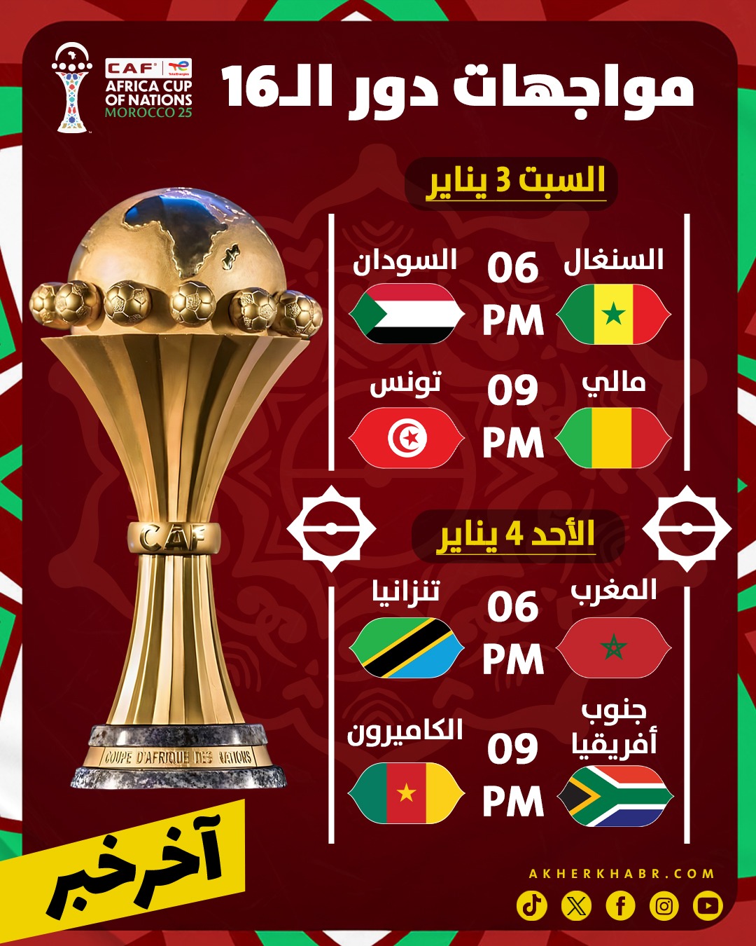 تفرض مواجهات دور الـ 16 نفسها كعنوان للإثارة، حيث يلتقي منتخب السنغال مع نظيره السوداني في مواجهة تبدو متوازنة على الورق، رغم الأفضلية النسبية لحامل اللقب، الذي يسعى لتأكيد أحقيته بمواصلة المشوار، بينما يطمح السودان إلى كتابة فصل جديد من المفاجآت.