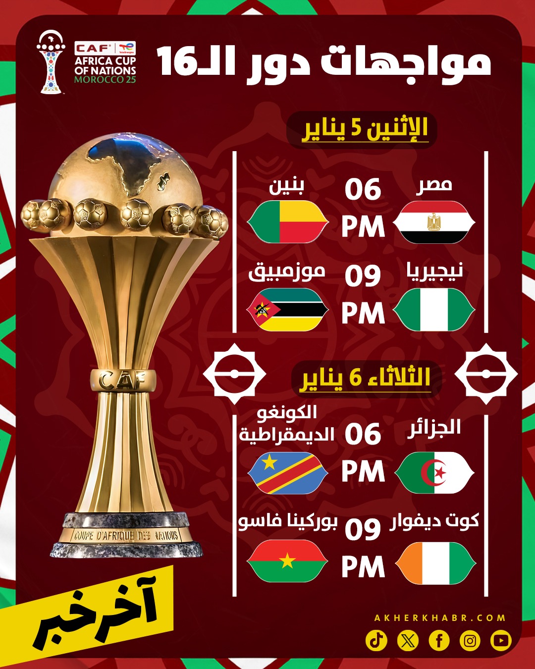 تواجه نيجيريا منتخب موزمبيق في لقاء تميل كفته للنسور الخضر، بينما يصطدم منتخب الجزائر بنظيره الكونغولي الديمقراطي في مواجهة لا تخلو من التعقيد. وتختتم كوت ديفوار مشهد دور الستة عشر بلقاء مرتقب أمام بوركينا فاسو، في مباراة تحمل طابع الثأر الكروي والطموح المشترك نحو اللقب.